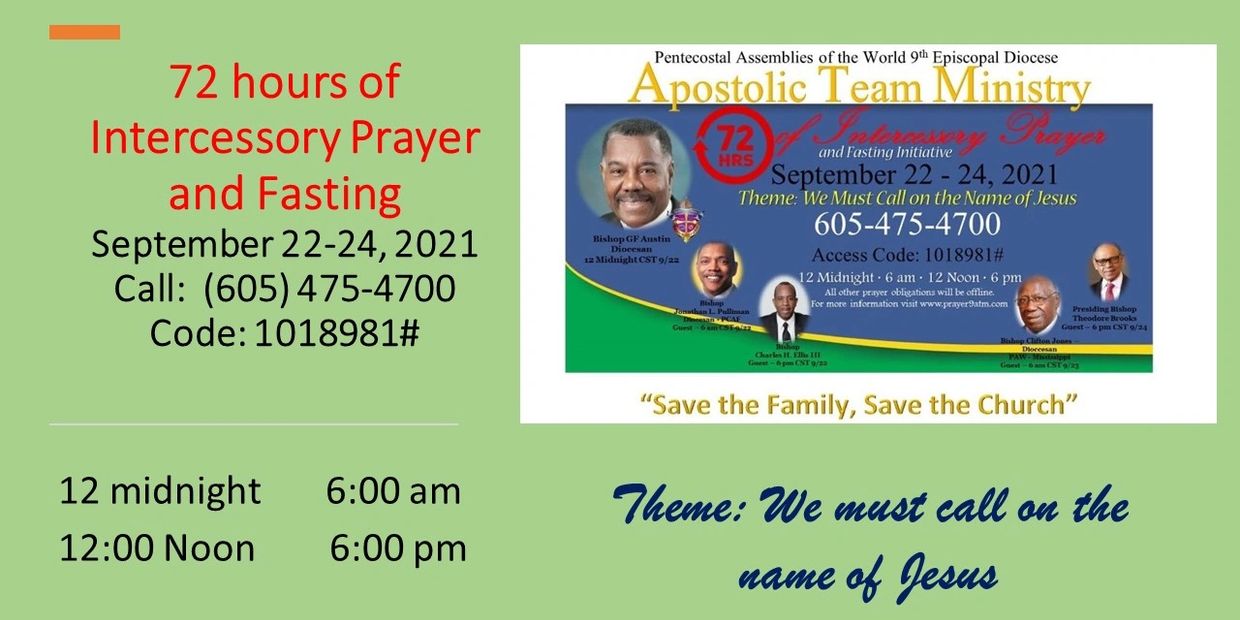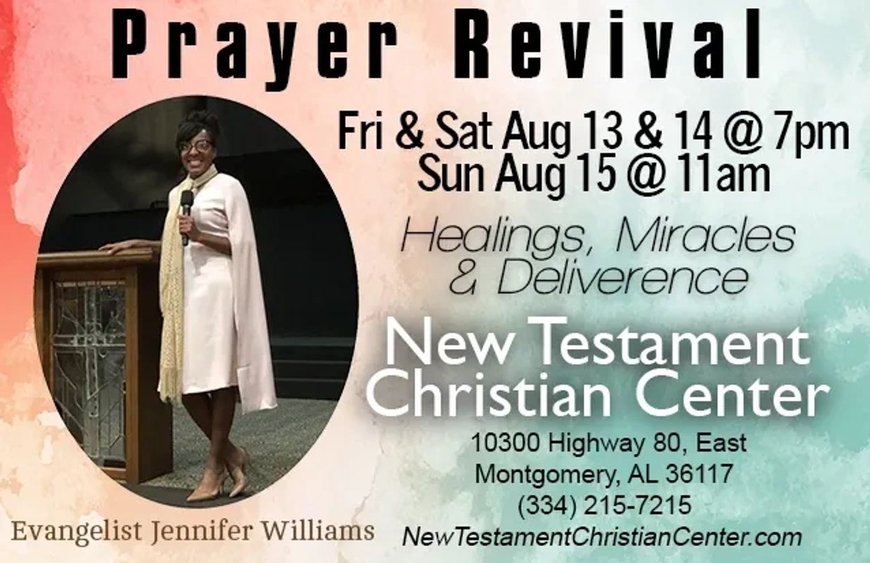New Testament Christian Center hosts a live prayer meeting each Saturday Morning at 8:00 am Central Standard Time (CST) and each Sunday evening at 6:00 pm CST. If you are interested in participating, join us at 10300 Highway 80 East Montgomery, Alabama.